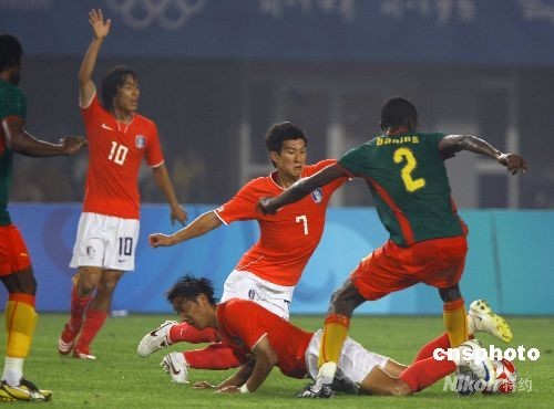 8月7日,北京奧運男子足球預賽,韓國對喀麥隆比賽在秦皇島奧體中心舉行,雙方1:1戰平。圖為韓國隊7號吳樁恩(紅衣)與喀麥隆隊2號阿爾貝·巴寧在比賽中激烈爭搶。中新社發 劉新 攝