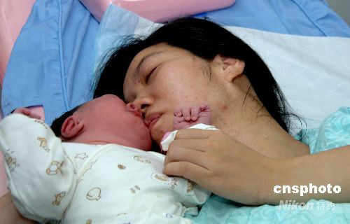 8月8日清晨5點(diǎn)30分,福州市民范敬琴在福建省第二人民醫(yī)院婦產(chǎn)科手術(shù)室順利產(chǎn)下一名奧運(yùn)男寶寶。圖為范敬琴親吻喜降人間的奧運(yùn)寶寶。中新社發(fā) 劉可耕 攝