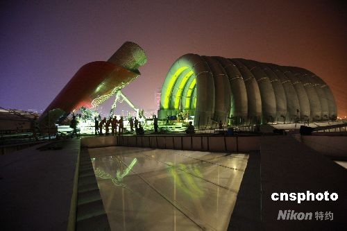 圖為7月23日深夜,鳥巢頂上的奧運火炬塔通過全自動液壓和行走系統緩緩行出高度保密的氣房子,準備進行第一次試點火。中新社發 佟偉 攝