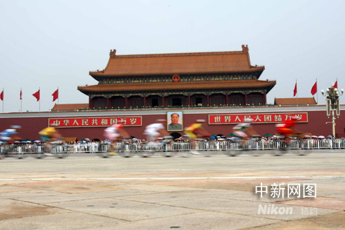 8月9日,2008北京奧運(yùn)會(huì)自行車男子公路賽在永定門(mén)到居庸關(guān)248公里的賽道上舉行。圖為選手經(jīng)過(guò)天安門(mén)廣場(chǎng)。 中新社記者 武仲林 攝