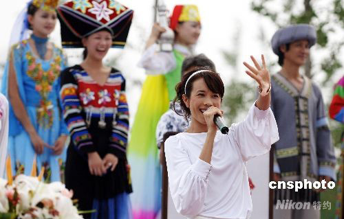 8月9日,大型文化展示活動《中國故事》在北京奧林匹克公園公共區正式開幕,香港影視歌三棲明星莫文蔚與少數民族演員同臺演出。中新社發 王東明 攝