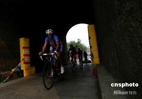 8月9日,2008北京奧運會自行車男子公路賽在從永定門到居庸關248公里的賽道上舉行。圖為選手經過八達嶺長城。中新社發 武仲林 攝