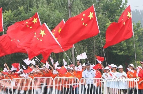 圖為賽道上處處國(guó)旗飄揚(yáng),幫選手打氣助威。中新社發(fā) 武仲林 攝