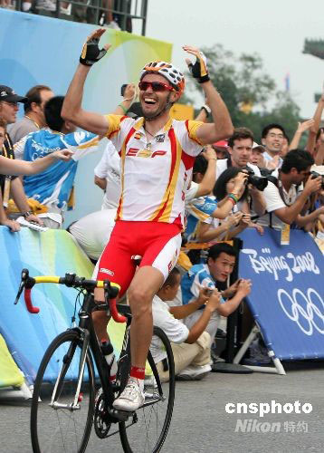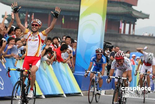 8月9日,2008北京奧運(yùn)會(huì)自行車男子公路賽落幕,西班牙選手薩·桑切斯以6小時(shí)23分49秒奪得冠軍。中新社發(fā) 武仲林 攝