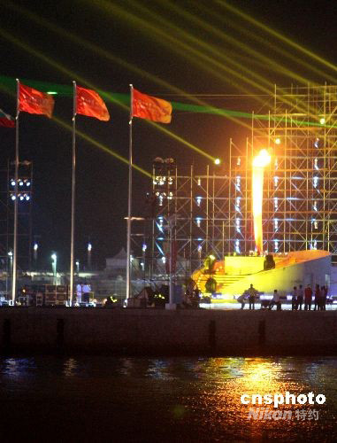 第29屆奧林匹運動會帆船比賽啟動儀式8月9日晚在青島舉行,由香港退役運動員李麗珊點燃的火炬在奧帆中心熊熊燃燒,成為青島一景。中新社發 趙振清 攝