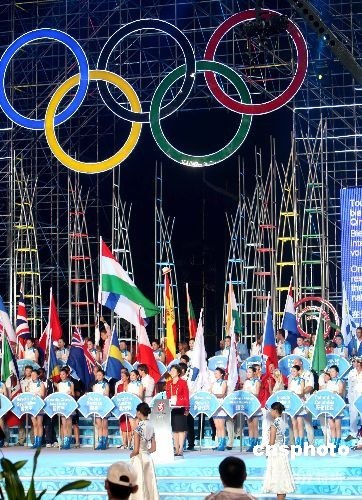 第29屆奧林匹克運動會帆船比賽啟動儀式8月9日晚在青島舉行,來自62個國家和地區的運動隊代表出席儀式。中新社發 趙振清 攝