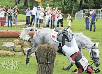 奧運(yùn)馬術(shù)三項(xiàng)賽的越野障礙賽11日早8時(shí)在上水雙魚河舉行,吸引近1萬名觀眾入場(chǎng)。其中,中國首名參加奧馬的18歲選手華天,在日前盛裝舞步賽環(huán)節(jié)中排名31,成績(jī)緊隨三項(xiàng)賽六朝元老托德之后。但11日越野賽中,華天跨越于8號(hào)“雨花臺(tái)”障礙欄時(shí),他策騎的馬“武松”前腳碰到障礙物,馬失前蹄,華天被拋落地面。