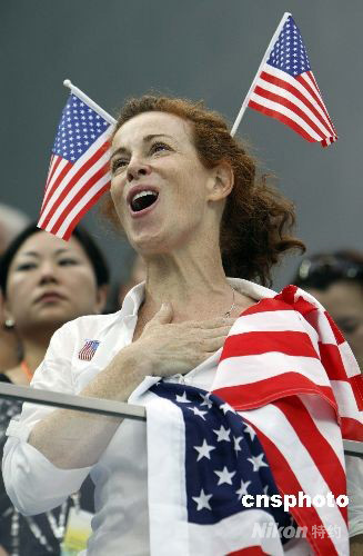 8月13日,一名美國觀眾和美國游泳隊(duì)一起高唱國歌慶祝勝利。當(dāng)日,美國隊(duì)在北京奧運(yùn)會男子4x200米自由泳接力項(xiàng)目上,奪得金牌并刷新世界紀(jì)錄,美國運(yùn)動員在“水立方”屢獲佳績,也成為美國觀眾最幸福的地方。中新社發(fā) 杜洋 攝