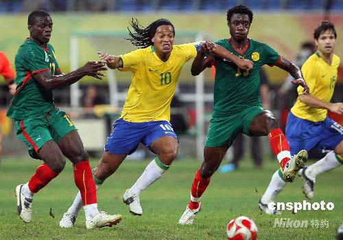 8月16日,北京奧運(yùn)會沈陽足球分賽場舉行男足1/4決賽,巴西隊通過加時賽,以2:0戰(zhàn)勝喀麥隆隊,進(jìn)入半決賽。圖為巴西隊球員羅納爾迪尼奧(左二)帶球突破。中新社發(fā) 張宇 攝