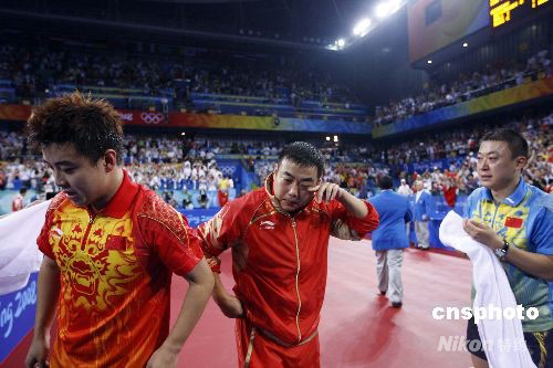 8月18日,中國隊奪得北京奧運會男子乒乓球團體金牌,主教練劉國梁、隊員馬琳、王皓淚灑賽場。中新社發 盛佳鵬 攝