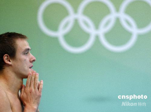 8月19日,北京奧運(yùn)會(huì)男子3米板半決賽在“水立方”進(jìn)行,來自加拿大的選手魯本·羅斯在起跳前祈禱動(dòng)作成功。 中新社發(fā) 杜洋 攝