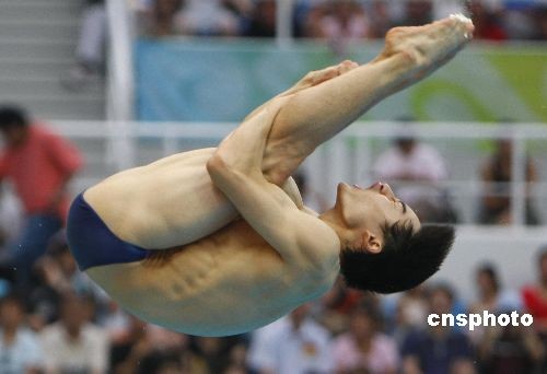 8月19日晚,北京奧運(yùn)男子3米跳板決賽在國(guó)家游泳館“水立方”舉行,中國(guó)選手秦凱以572.90分獲得銅牌。他的隊(duì)友何沖以572.90分奪取金牌。 中新社發(fā) 杜洋 攝