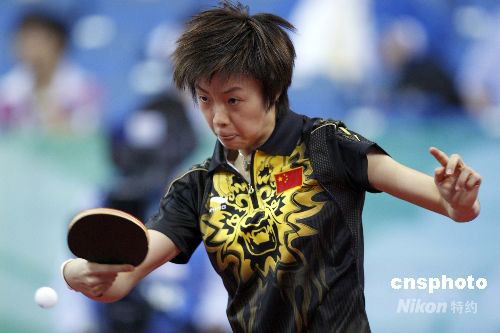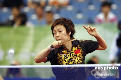 8月21日,北京奧運會乒乓球女子單打第四輪的比賽在北京大學體育館進行,中國選手張怡寧4比1戰勝日本選手福原愛晉級下一輪比賽。中新社發 盛佳鵬 攝