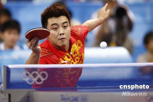 8月21日,北京奧運會乒乓球男子單打第三輪的比賽在北京大學體育館進行,中國選手王皓4比0戰勝奧地利選手陳衛星晉級下一輪比賽。圖為王皓在比賽中。中新社發 盛佳鵬 攝
