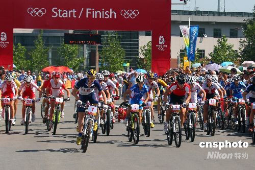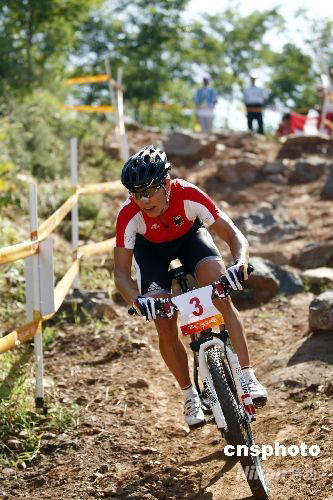 8月23日,北京奧運會自行車山地分項女子越野賽在北京老山山地自行車場舉行。德國選手扎比內·施皮茨一路保持領先,最終以1小時45分11秒的成績順利摘金。波蘭選手馬婭·沃什佐夫斯卡獲得銀牌,俄羅斯選手伊琳娜·卡連季耶娃獲得銅牌。中國選手任成遠獲得了第5名,另一位中國選手劉穎最終獲得第12名。中新社發 盛佳鵬 攝