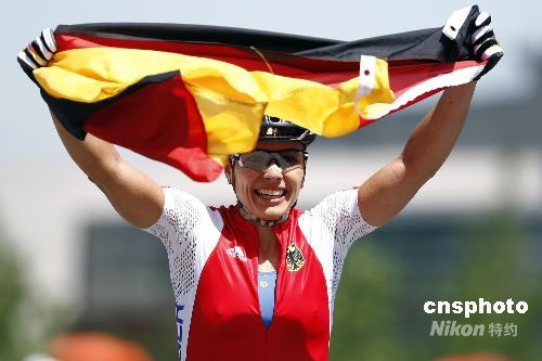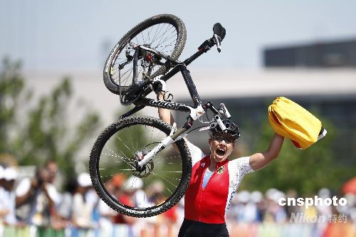 8月23日,北京奧運(yùn)會(huì)自行車(chē)山地分項(xiàng)女子越野賽在北京老山山地自行車(chē)場(chǎng)舉行。德國(guó)選手扎比內(nèi)·施皮茨一路保持領(lǐng)先,最終以1小時(shí)45分11秒的成績(jī)順利摘金。中新社發(fā) 盛佳鵬 攝