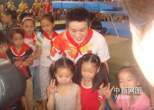 回到常州家中看望爸媽的奧運冠軍陸春龍,今天在母校江蘇常州少兒體校儼然成了偶像明星,就連中午與親朋好友及恩師團聚的飯桌上,飯店的服務員也沒有放棄這個可以“親密接觸”奧運冠軍的機會,紛紛要求合影、簽名,使得陸春龍的手只能拿筆而不能拿筷子。雖然簽名簽到手發麻,但陽光的笑容始終定格在“蹦床王子”的臉上。
