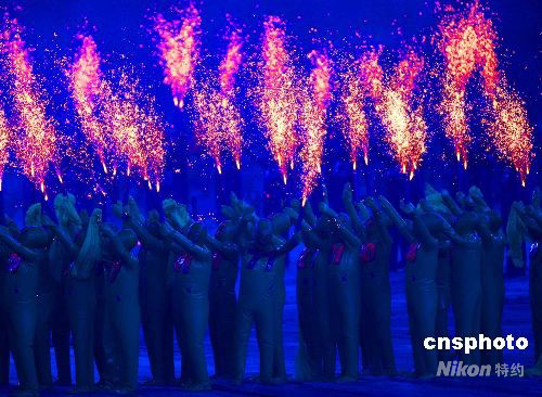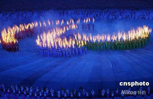 9月6日20時,北京2008年殘奧會開幕式在國家體育場“鳥巢”舉行,中華人民共和國主席胡錦濤,國際殘奧委會主席克雷文先生等出席。開幕式上,卡通玩偶用手中燃放的焰火組成北京殘奧會會徽圖案。 中新社發 盛佳鵬 攝