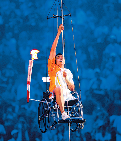 9月6日晚,“鳥巢”再次成為全球的焦點。殘疾人田徑運動員侯斌以震撼世界的方式,點燃了北京2008年殘奧會主火炬:他坐在輪椅上,將火炬安置在輪椅的火炬支架上,獨自拉緊繩索,牽動著自己和所乘坐的輪椅緩緩向上攀升,用雙手完成了向主火炬的“攀登”。殘奧會主火炬點燃的一剎那,全場沸騰了……