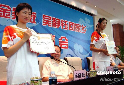 9月8日,江西省景德鎮(zhèn)市熱烈歡迎北京奧運(yùn)會(huì)冠軍金紫薇、吳靜鈺載譽(yù)回鄉(xiāng),景德鎮(zhèn)市婦聯(lián)和團(tuán)委分別授予兩人“三八紅旗手標(biāo)兵”稱號(hào)和“五四青年獎(jiǎng)?wù)隆薄T诖舜伪本⿰W運(yùn)會(huì)上,金紫薇和吳靜鈺分別奪得賽艇女子4人雙槳項(xiàng)目和跆拳道女子49公斤級(jí)比賽冠軍。 中新社發(fā) 程萬(wàn)海 攝