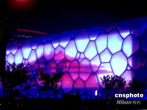 在北京殘奧會舉辦時節,國家游泳中心“水立方”的墻面上投影出著名的故宮角樓圖像,更顯示迷人的夢幻色彩。 中新社發 賈國榮 攝