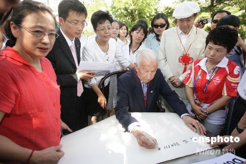 圖為薩馬蘭奇正在為東四奧林匹克社區博物館題字。中新社發 郝飛 攝