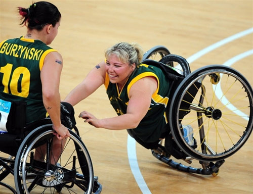 9月8日,殘奧會輪椅籃球賽,澳大利亞隊對巴西隊的比賽中,澳大利亞的凱莉·戈西跌倒后,另一名隊友克萊爾·布爾津斯基前來幫忙。