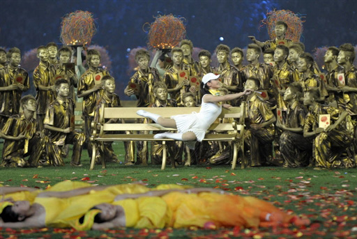 9月17日晚8點,北京2008年殘奧會閉幕式在國家體育場“鳥巢”舉行。這是閉幕式上的文藝表演《澆灌》。