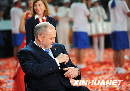 9月17日,北京2008年殘奧會閉幕式在國家體育場“鳥巢”舉行。圖為國際殘奧委會主席克雷文在致辭前拾起場內的紅葉紙花放入衣袋。新華社記者 李尕 攝