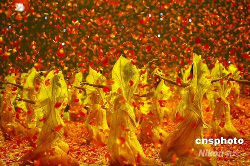 圖為文藝演出中紅葉紛紛從頂端飄落。 中新社發 杜洋 攝