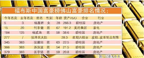 對(duì)比20天前剛剛發(fā)布的胡潤(rùn)富豪榜,在佛山富豪方面,新的福布斯排行榜表現(xiàn)出了上榜人數(shù)少、富豪身家縮水的特點(diǎn)。例如楊惠妍在胡潤(rùn)榜上顯示的財(cái)富是330億元,而福布斯顯示為266.3億元,而何享健的身家也縮水4億元。此外,格蘭仕梁德慶、金盛盧氏等在胡潤(rùn)榜單中有優(yōu)秀表現(xiàn)的本地富豪在福布斯中卻不見蹤影。