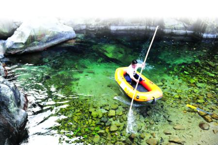 水清見底,看來不過一米。可用岸邊短竹竿一插,竟深有好幾米。欲渡此潭,必坐皮艇不可。同行人脫褲下水,想用竹竿勾來,可惜竿還是不夠長,而水已沒至腰。