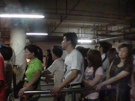 7月29日晚9點多,記者進入火車站出站口,沿著指示牌上的“的士候客點”,隨人流一起來到地下停車場昏暗高溫的地下停車場里乘客們個個汗流浹背 排著,長隊等候出租車。奇怪的是,偌大的停車場內,看不到一輛出租車。