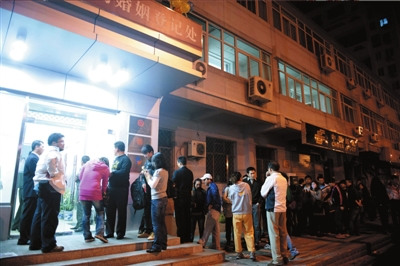 據(jù)了解,絕大部分婚登機(jī)關(guān)在早6點(diǎn)開(kāi)門辦公,少數(shù)幾個(gè)區(qū)如朝陽(yáng)婚登處因?yàn)橛行氯嗽缭缇蛠?lái)排隊(duì),在零點(diǎn)就開(kāi)門為新人辦理登記手續(xù)。