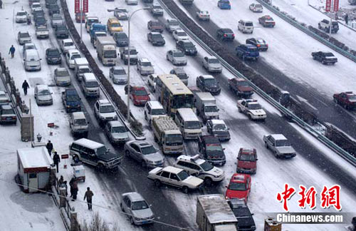 由于大雪的緣故,烏魯木齊街道部分路段交通擁擠,車輛排起長隊。記者在烏魯木齊東外環(huán)路金銀大道段看到,百余輛車在此停滯排隊,綿延數(shù)公里。