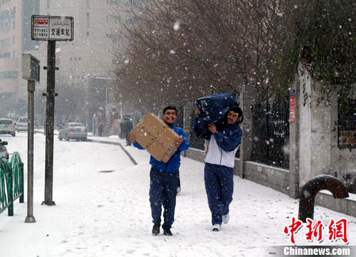記者在烏魯木齊街頭看到,道路上的行走較往日減少,因為天冷路滑,市民大多都擠上了公交車,還有人焦急地等待出租車。到中午11點時,雪花開始變大,記者到外面拍照采訪,來回不到二十分鐘的時間里,記者身上落滿了一層雪花。