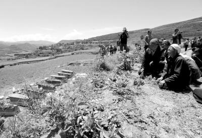 昨天下午,在擺放遺體的黃坡地里,一隊消防官兵默默地用鐵鍬挖掘著。在一排新買的棺木旁,4口大坑很快挖成。悲傷的人們取來紙錢,燒給逝去的親人。