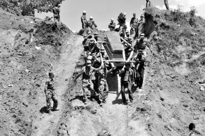 22日,解放軍官兵幫助永光村受災群眾將棺材抬到下葬地點。