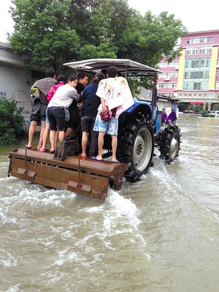 臺風(fēng)“菲特”帶來的強降雨致使道路成了洼地,過路成了“過河”,給人們出行帶來極大的不便。昨天,鄞州橫溪鎮(zhèn)的小伙子張超,特地開著自家耕田用的拖拉機,來回載著村民們進出村里。