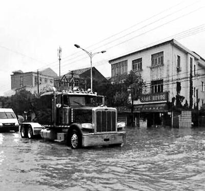 8日深夜,余姚市中心水深沒腰,道路一片漆黑。汪洋之中,一臺碩大的重型卡車喘著粗氣,在深水中往返救援。撕開夜幕的車燈光,給一些被大水圍困了兩天的群眾帶來了希望。