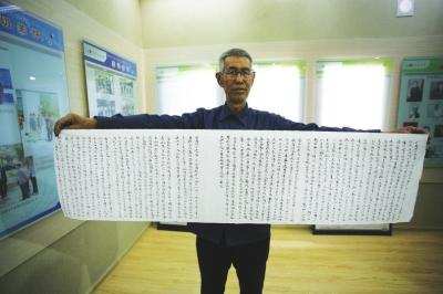 這幅書法長卷巨作,一字字、一句句,凝結著對黨的感恩。它的作者蘆臨鳳說:“雖然我不是黨員,但是我知道是誰讓農人翻身,是誰讓我們吃上了甜水,我寫這幅長卷黨史,就是想感謝我們的黨,讓黨史告訴如今的幸福生活是怎么來的!”