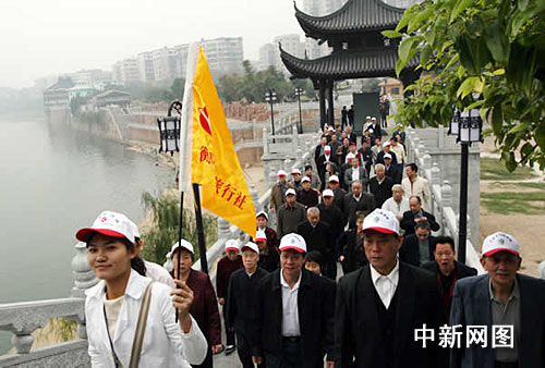 中新網長沙10月19日電(王永華)今天是農歷的九月初九,中華民族傳統的重陽佳節。為歡度重陽節,湖南衡陽市今天主辦了千名老人游雁城活動。上午,千名老人頭戴統一的遮陽帽,分乘30輛大巴分別向陸家新屋、湘聯學聯、湖湘文化館、石鼓書院等6個景點參觀。