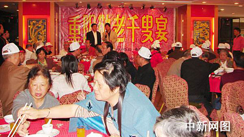 中午,出游歸來的千名老人又相聚在王府酒樓參加“千叟宴”,舉杯共慶“重陽節”。席間但看壺中酒,杯杯先敬老年人。衡陽市長彭崇谷在盛宴開始后,舉杯向老人們敬酒。席間,主辦方還朗誦了清朝康熙皇帝在陽春園第一次舉行千人大宴中席賦的《千叟宴》詩一首,博得老人們的陣陣掌聲。今年已80高齡的鄭仲儀老人飲了兩杯酒后,興奮不已,對記者說,自己還從來沒有與這么多的老年人一同赴宴,能參加這樣的盛宴,不管吃什么自己都覺得很開心。回去后將告訴兒孫們,要把中華民族敬老愛幼的傳統美德一代一代傳承下。