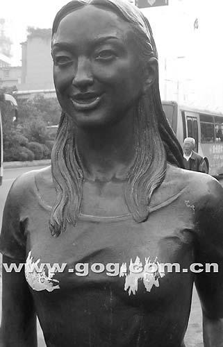 昨日,記者途經(jīng)河濱公園門前的人行道上時(shí),見(jiàn)到兩塊都市牛皮癬居然粘貼在銅像雕塑少女的胸部,一些市民覺(jué)得實(shí)在不雅,想撕掉卻因粘得太牢而無(wú)果。(記者 陳華飛)