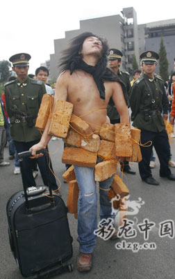又是他!繼今年5月1日在南屏步行街以全身貼滿人民幣的形式進行了一場名為“金錢加權力等于一切嗎”的行為藝術后,云南藝術學院03級油畫班畢業生王軍昨天背負磚頭行走兩個多小時,用他覺得最棒的方式說一聲:“昆明,我走了。”