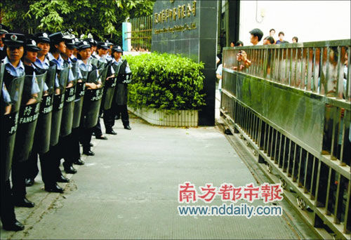 “工人把107國道堵了!”昨日下午2時許,司機劉先生給本報打來電話,說在寶安西鄉107國道南太天橋自寶安往關內方向被多名工人封堵。造成寶安方向交通堵塞,車輛大排長龍。記者下午3時許到達現場時,堵路情況已經緩解,工人們在街道辦和勞動部門勸解下逐漸回到廠內。在位于西鄉南太路的華洋公司門外,多名警察身攜防暴裝備嚴陣以待,防止暴力事件的發生。另有幾十名巡防隊員、保安守在門口。
