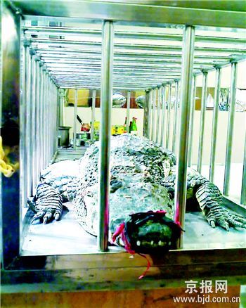 昨晚7時,記者來到位于魏公村的美洲島國際美食中心,在餐臺盡頭的中餐區,一只長約160厘米、寬80厘米的鐵籠子隱藏在食物中間,一只身長約1.7米的鱷魚一動不動地趴在里面,顯得毫無生氣。鱷魚的尾巴蜷縮起來,眼睛緊閉,大嘴被一圈圈紅布綁得緊緊的。鱷魚兩旁趴著兩只大草龜,正努力地想往鱷魚背上爬。