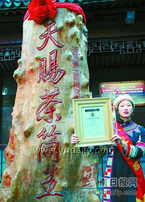 記者看到大茶筒上面刻有“天賜茶筒王”字樣,把茶放到這么高的茶筒里,要取茶方便嗎?工作人員從茶筒的下方打開了一道小門,里面的小茶坨就滾了出來,一點都不麻煩。當天,上海大世界基尼斯總部給大茶筒頒發(fā)了“大世界基尼斯之最,最大的古樹茶筒‘天賜茶筒王’的證書”。