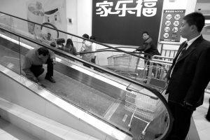 昨天中午1點(diǎn)多,記者在家樂福立水橋店看到,3層到2層的下樓電梯已停運(yùn)。在電梯下口處,最底端的兩塊兩米長玻璃擋板已完全破碎,電梯縫中仍卡著大量玻璃碎片,保潔人員正在清理。