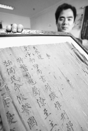 據史先生介紹,他老家在河南商丘,去年,祖母鄭重地將這道傳了500余年的圣旨交給了他,“但我一直不知道是真是假,想請專家幫忙鑒定。”(馬晶晶)